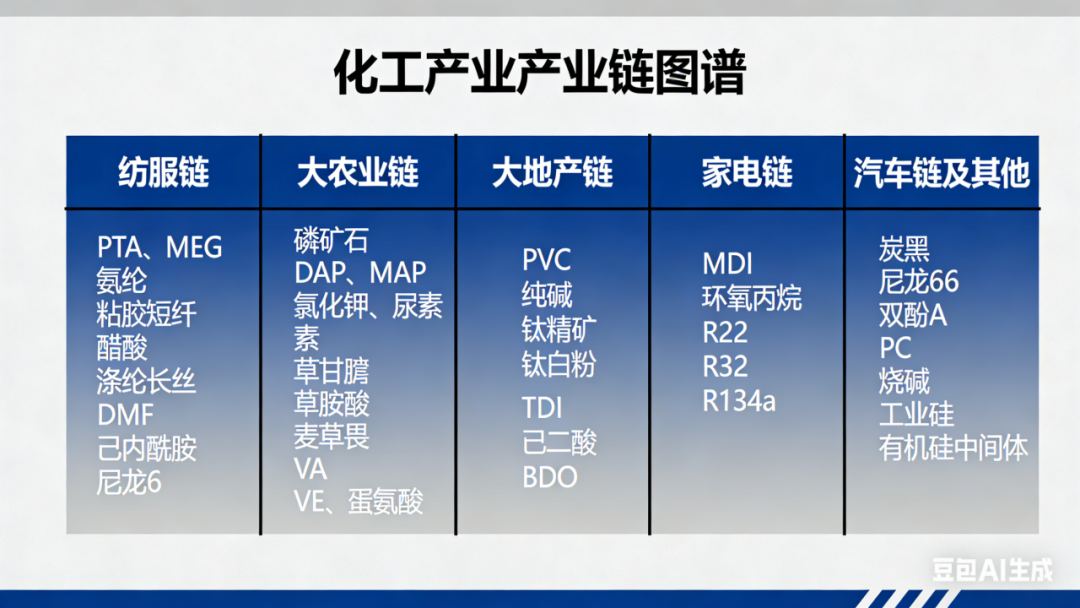 产业链复杂:上游为石油、天然气、煤炭等基础原料,中游为各类基础化工品和精细化工品,下游覆盖农业、工业、消费等众多领域。产业链长,各环节关联性强,需关注上下游传导关系。