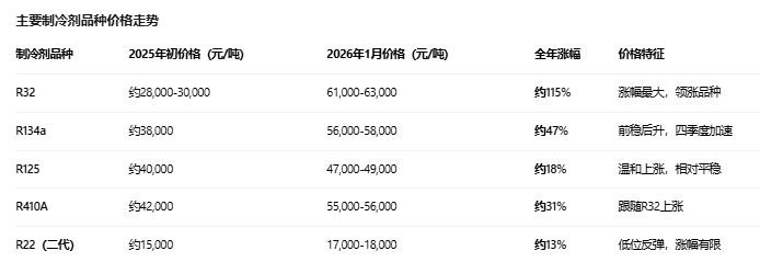 此外,部分化工品种还存在像电解铝一样的供给限制(我国电解铝产能上限为4500万吨/年,截至2025年底,国内电解铝运行产能约4400万吨,已接近产能天花板,剩余合规空间不足100万吨),比如氟化工里的制冷剂,2025年是三代制冷剂(HFCs)配额管理全面实施的第二年,生产配额总量受限且逐年削减,供给端刚性约束成为价格上涨的核心支撑。R32、R134a等主流品种配额分配集中度高,头部企业控量挺价意愿强烈。