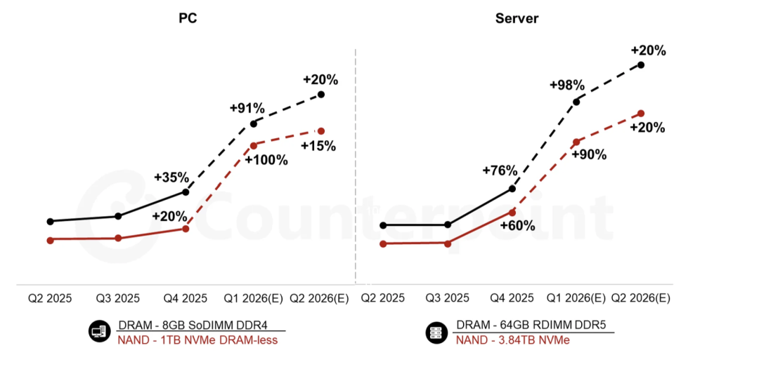 2025 年第二季度至 2026 年第二季度(预测):PC 及服务器内存价格走势
