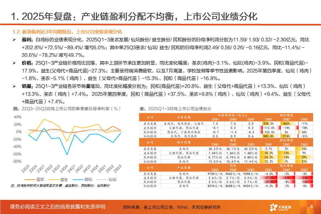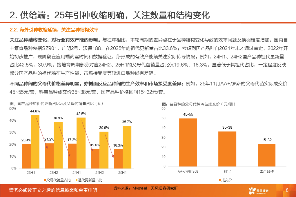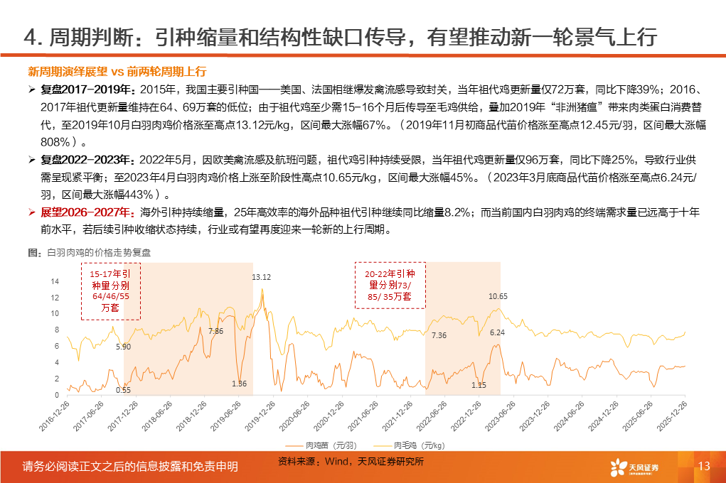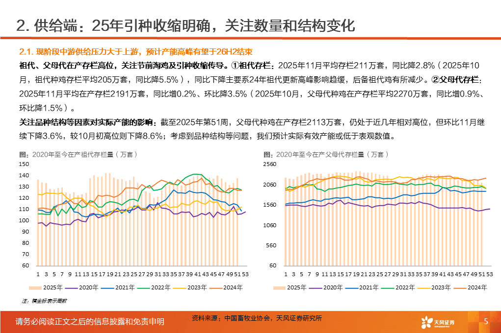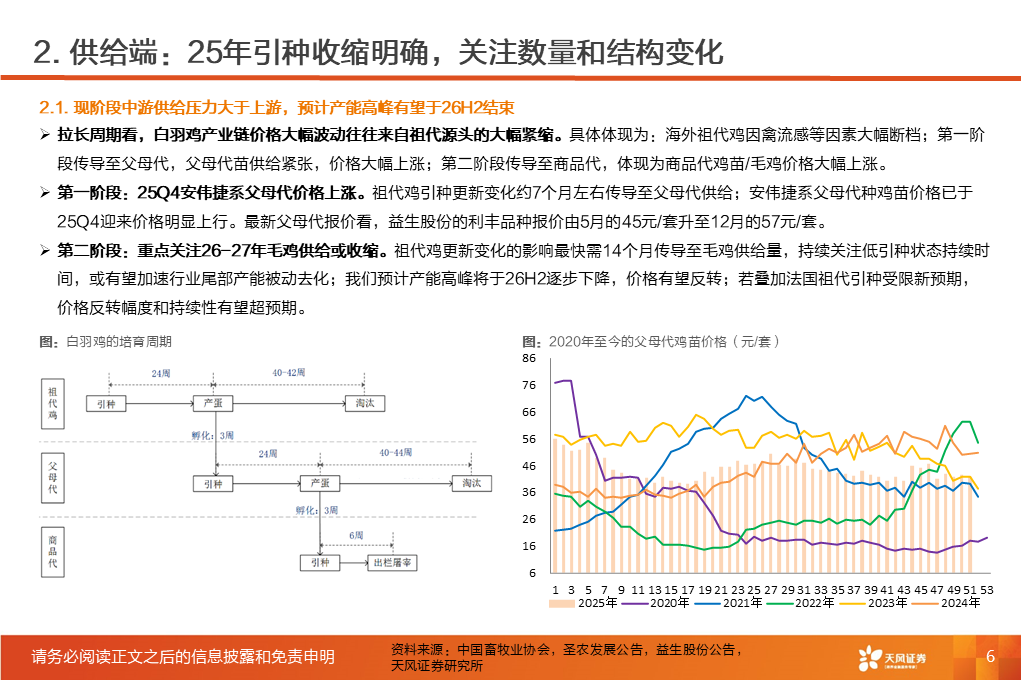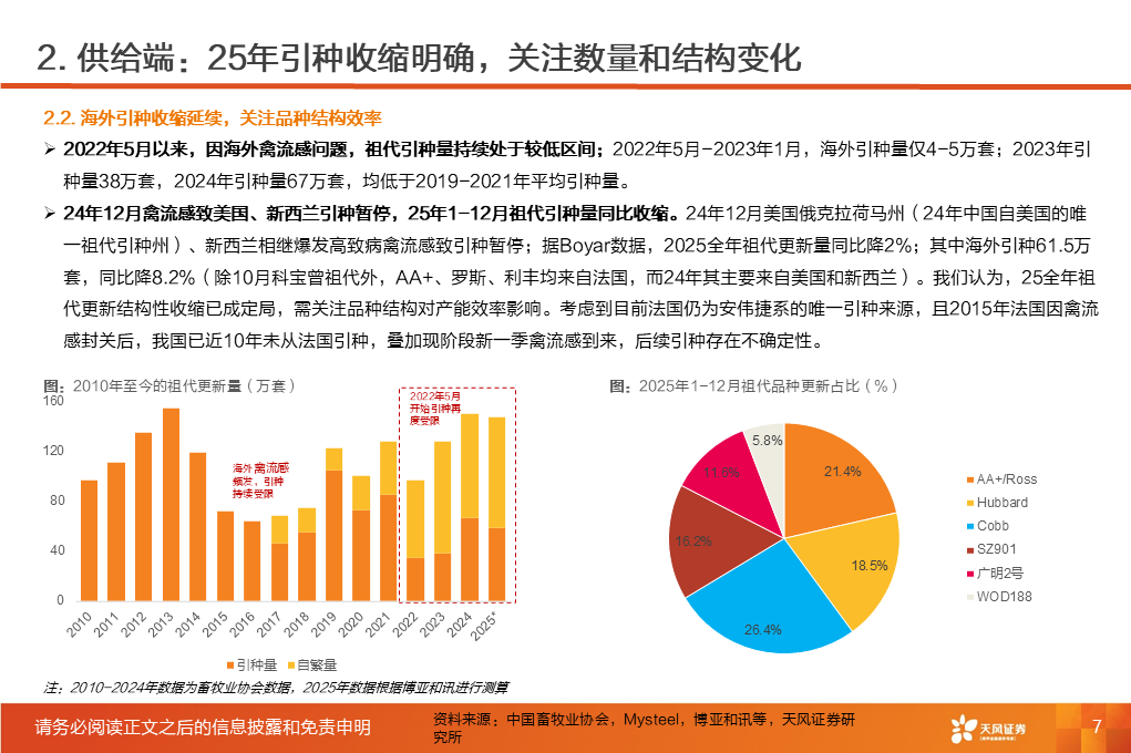 ①行业磨底已持续3年,产能收缩意愿强化,25Q1-3作为行业头部代表的上市板块盈利处于近3年同期低位。②受全球高致病性禽流感影响,上游祖代引种震荡,虽国产增量较明显,但仍存在品种结构变化带来的产能效率损失。2025年1-12月祖代更新量同比下降2%(其中,海外引种近62万套,同比下降8.2%,除10月科宝曾祖代外,AA 、罗斯308、利丰均来自法国,而2024年其主要来自美国和新西兰)。③25年11月底,中国海关总署公示禁止法国曼恩-卢瓦尔省等十余省份禽及相关产品进口;12月29日,法国阿摩尔滨海省发生H5N1高致病禽流感致引种再度暂停;预计安伟捷系引种量有可能进一步下降。我们预计,海外引种受限及品种结构变化将进一步放大上游供给缩量及效率问题;行业产能高峰或于26H2开始转向下行,有望推动价格景气反转。