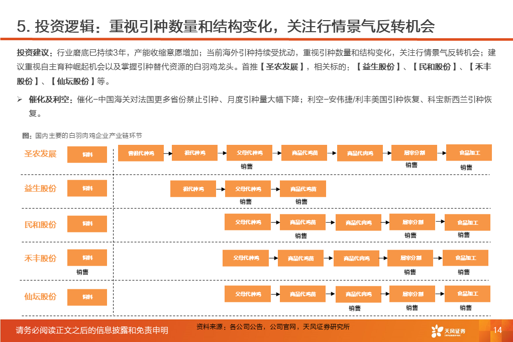 投资建议:行业磨底已持续3年,产能收缩意愿增加;当前海外引种持续受扰动,重视引种数量和结构变化,关注行情景气反转机会;建议重视自主育种崛起机会及掌握引种替代资源的龙头企业。首推【圣农发展】(国内自主育种唯一上市标的,全产业链降本有望铸就超额收益),相关标的:【益生股份】(祖代引种份额高位再突破,种鸡、种猪持续上量)、【民和股份】、【禾丰股份】、【仙坛股份】。