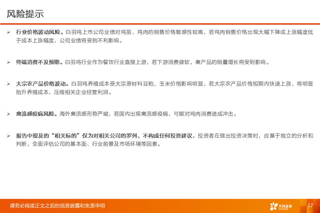 风险提示:行业价格波动风险,终端消费不及预期,大宗农产品价格波动,禽流感疫病风险;“相关标的”仅为对相关公司的罗列,不构成任何投资建议。