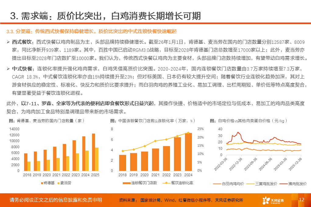 ①上一轮“非瘟”驱动下,白鸡对猪肉的消费替代明显,2019年后国内人均鸡肉消费抬升至10kg/人以上;对标美国、韩国、日本等仍有较大提升空间。②鸡肉作为优质蛋白来源,兼具健康、效率优势,近年在肉类消费中的份额稳步提升;2025年,农业农村部、卫健委、工信部联合印发《中国食物与营养发展纲要(2025-2030年)》,明确将“优化畜禽肉类产销结构,扩大禽肉消费”列作重点任务之一。③麦当劳、百胜中国等头部西餐品牌持续拓店并提出涨价计划,中餐品牌连锁化率提升,双轮驱动对鸡肉食材需求增加;同时,扩内需、促消费政策提振,利好白鸡库存消化和需求向上。