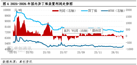 据卓创资讯数据测算统计,截至1月30日,1月份主力山东地区异丁烯行业平均毛利润为-45元/吨,较12月下降153元/吨。1月异丁烯装置利润继续减少,且出现亏损情况,其中月底装置亏损超过250元/吨。主要是1月原料MTBE价格下跌幅度整体低于异丁烯。而且1月下旬MTBE价格反弹快于异丁烯,导致当时装置亏损较高。 由于1月份装置盈利情况不佳,导致异丁烯价格难有继续深度下跌的空间,对于异丁烯价格底部形成支撑。