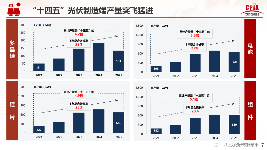 与产能同步攀升的还有产量。“十四五”期间,制造端产量突飞猛进。光伏各环节累计产量均为“十三五”时期的4~5倍,五年复合增长率最低为22%,成为近三个五年计划中增长最快的时期。