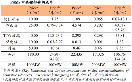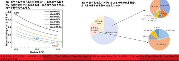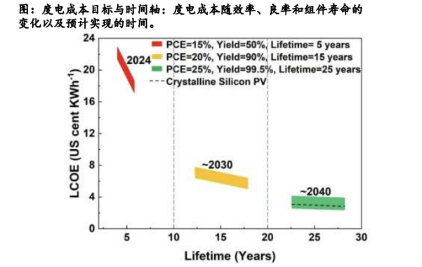 稳定性问题带来的寿命较低:产业化首要障碍,钙钛矿材料在潮湿、高温、强光、氧气等环境下易发生分解,理论使用寿命仅5-15年,远低于晶硅组件的25年。 当前综合解决方案包括:组分工程:引入大尺寸疏水有机阳离子(如FA 、 MA )优化容忍离子,稳定晶相;使用无机Cs 提升效率。界面工程:开发新型传输层材料(如SnO₂、自组装单分子层)和缺陷钝化技术(使用路易斯碱、碘化钾等),显著减少非辐射复合和降解起点。封装技术:采用高性能阻水阻氧胶膜(如丁基胶、原子层沉积氧化物薄膜)进行全方位封装,是保障组件25年寿命的最后一道屏障。 当前阶段组件户外稳定性进步很大。首次参与德国莱茵TÜ V认证,仁烁光能0.72m2(1.2m×0.6m)的商用尺寸组件即全面通过了包括湿热测试、热循环测试、紫外测试等在内的全序列IEC 61215/61730可靠性认证。随后,该组件又先后获得美国UL、中国产品质检中心CQC的认证或许可,充分验证该产品已全面达标国内外销售标准。组件经一年多户外实证结果显示,该工艺路线下的组件运行稳定无衰减。当前钙钛矿叠层电池并未量产,多数厂商给出的的单瓦价格为1.2-1.5元,对比晶硅组件约0.7元/W的水平明显偏高,远超钙钛矿叠层电池更高的转换效率带来的BOS成本下降。 钙钛矿成本中,材料成本占比68%,为最大部分,资本开支折旧成本与其他成本分别占比15-16%; 成本的降低需要效率和良率的协同调控。当前商业组件仅约15%效率,远低于商业晶硅组件,同时由于产线缺乏大规模生产经验、工艺标准化缺失,良率仅约50%,显著推高了单瓦制造成本。成本高企,对比晶硅电池难以具备性价比,度电成本能否低于晶硅,是钙钛矿能否取代晶硅的终极问题,钙钛矿电池降本方向包括:效率>25%,良率>99.5%:模块组件效率要实现25%,对应小面积电池效率需突破28%;减少电池到模块的效率损失,需要从当前的7%的效率损失减少为3%的效率损失;良率从目前的50%提高到超过99.5%。 材料成本最少降低40%:FTO玻璃占据超过1/3的材料成本,进一步降低透明导电基底的价格,甚至开发更廉价的透明导电基底以满足成本的需求。通过调控各层厚度(如寻找最佳C60电子传输层和ITO电极厚度)和提高材料的利用率以减少材料用量。开发新型的电子传输材料,开发高新能SnO2等廉价的无机材料作为电子传输层代替C60。 降低真空设备依赖:减少真空工艺,开发更廉价、更高效的薄膜沉积方式成为降低成本的关键途径;推动设备国产化,通过规模效应能有效降低成本。2024年示范线所需投资15-18亿元/GW;2025-2026年规模线,随设备国产化、工艺标准化,预计降至8-12亿元/GW;2027年及以后,叠层(钙钛矿/晶硅、钙钛矿/钙钛矿)若良率>90%,单位投资可能进一步下探至6-9亿元/GW。04