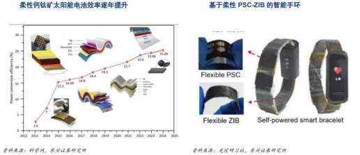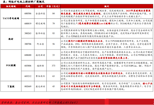 上游:原材料与生产设备—成本与性能的核心支撑。原材料包含核心功能材料与辅助材料,其中TCO导电玻璃、钙钛矿层材料、POE胶膜及丁基胶等为核心品类,成本占比较高,且对应供应商格局相对集中,是决定电池性能与成本的关键环节。同时,上游还涵盖各类生产设备供应(包括镀膜设备、涂布设备、激光设备、封装设备等),为中游制造提供技术保障。TCO导电玻璃作为钙钛矿电池的前电极、窗口材料和支撑材料,主要功能为让大部分太阳光进入吸收层,实现光电转换;利用其导电性作为前电极,收集电池电流;为电池多层膜材料结构提供物理上的机械支撑。钙钛矿电池在封装的要求相比晶硅电池更高,一般采用POE胶膜而不能采用EVA胶膜,POE胶膜相比EVA胶膜的封装效果和稳定性更好。镀膜设备主要用于制备电池的各个功能膜层,该方法形成的膜层更加致密,发电效率更高。镀膜设备价值量最高,占据设备投资绝大比例。百MW级产线中镀膜设备占比50%,生产百MW级钙钛矿需要镀膜设备3台(2台PVD,单价1000万/台;1台PRD,单价2000万/台)。未来镀膜设备国产化 湿法化为降本主要途径。涂布设备主要用于制备核心钙钛矿薄膜层,主要以狭缝涂布技术为主,适宜控制钙钛矿层大面积制备时的均匀性,是量产工艺的主要方法。百MW级产线中涂布设备占比25%,单台价值1000万 ,湿法制备需2台,钙钛矿层与钝化层合计超2000万。激光设备主要用于将整片电池分割为多个子电池的串联结构,可以进一步提升电池性能。百MW级产线中激光设备占比15%,需要3-4台,总价值量1000-1500万,单台价格250-375万。封装设备作为隔绝环境侵蚀的核心手段,对保障钙钛矿组件的稳定性至关重要,其中层压封装工艺具有高效、致密的特点。百MW级产线中封装设备占比10%,单台价值1200万左右,连同后道设备价值量共3000万 。中游:电池/组件制造—量产落地的核心驱动力,技术壁垒最高。技术路线以单结钙钛矿电池与更具发展前景的钙钛矿—晶硅叠层电池为主,市场参与者众多,技术迭代与量产能力是核心竞争力。钙钛矿组件生产流程简单,可在45分钟内将化工原料、玻璃、靶材、胶膜在单一工厂加工为组件,工艺流程较短,易于扩大生产,相比晶硅电池的多工厂分工生产更具效率优势。隆基绿能、天合光能、晶澳科技、晶科能源、阿特斯、协鑫科技等主流组件厂商均布局钙钛矿组件领域。下游:应用场景—市场化拓展的关键场景,应用场景广泛,初期以差异化场景为核心,当前主要聚焦光伏电站、分布式光伏领域,随着技术持续成熟,未来将拓展至柔性电子设备、光伏建筑一体化(BIPV)、电动汽车车顶等场景。原材料是钙钛矿电池量产的基础,其性能与供应直接影响电池成本与可靠性。原材料供应商的技术成熟度、产能节奏,将直接决定钙钛矿电池的商业化降本与规模落地速度。工艺日渐成熟,钙钛矿设备市场空间广泛。钙钛矿设备中,真空镀膜设备、涂层设备、激光设备,价值量占比排在前三位。钙钛矿光伏市场呈现“中国引领产能扩张,欧美聚焦技术革新”的双轨格局,技术路线从“实验室效率竞争”向“量产效率与稳定性并重”转变。隆基绿能:经美国国家可再生能源实验室(NREL)认证,其自主研发的晶硅-钙钛矿两端叠层太阳电池转换效率达34.85%。极电光能:全球首条GW级钙钛矿光伏组件产线正式运行。协鑫光电:GW级钙钛矿产线首片2400mm×1150mm全尺寸钙钛矿组件正式面世。海外方面,英国Oxford PV、美国NREL等在技术突破方面持续发力;日本企业在柔性钙钛矿技术领域有所布局,如丰田与Enecoat Technologies合作开发车顶钙钛矿电池。4、下游:钙钛矿电池应用领域广泛,太空光伏成为钙钛矿商业化的关键应用场景(1)柔性钙钛矿电池可在建筑一体化/可穿戴设备/移动电源/车载发电等多领域应用柔性钙钛矿电池应用领域丰富,柔性结构特征及高功率优势明显。柔性钙钛矿太阳能电池凭借其轻量化、可弯曲性、可拉伸性和可扭曲性等多项关键特性,可在建筑一体化、可穿戴设备、车载发电、移动电源、便携式电子设备等多个领域实现突破性应用。通过新型封装工艺,钙钛矿组件可承受10万次弯折并完美适配各种曲面(传统硅基光伏仅300次)。同时,柔性钙钛矿电池具有极端环境生存力,在-20℃低温效率保持率达92%(常规光伏仅65%),在湿热环境(85℃/85%RH)下衰减率<3%/年。截至2025年,柔性钙钛矿太阳能电池效率已可达25%以上,远高于其他主流柔性太阳能电池(CIGS:14%~18%;非晶硅:10%~12%)。 此外,由于钙钛矿电池在低光照条件下仍能高效发电,因此其更适用于可穿戴设备的室内应用场景。在车载发电领域,钙钛矿光伏车载发电或进入普及化阶段。特斯拉于2025 年7月发布专利,将用高强度聚合物代替钢、铝,制造带颜色的车身面板以取代喷漆环节。在此过程中,特斯拉在材料中嵌入功能性薄膜,包括集成电子门把手感应区、LED灯膜以及钙钛矿薄膜等。目前,特斯拉Cyber Cab车型已确认搭载此项技术,且未来或在更多车型上应用。至2024年,钙钛矿电池在可穿戴设备、车载发电、移动电源、便携式电子设备等新兴应用场景下的需求占比约为20%。随着钙钛矿电池的量产化普及,其柔性化特征及高功率优势或推动新兴需求成为钙钛矿电池需求增长的核心力量。