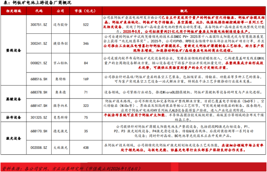 公司是一家以高端装备为核心业务的集团公司。主要业务包括光伏设备、瓦楞纸包装设备两大领域,其他业务包括铸造和锂电自动化设备等。公司成立于1957年,前身是湖北省京山轻工机械厂。1998年6月,京山轻机在深交所主板正式挂牌上市。2015年并购了三协精密,外延扩张切入工业自动化领域。2017年,京山轻机又并购了晟成光伏,正式进军光伏领域。公司在钙钛矿领域具备先发优势,覆盖研发线至GW级量产方案。作为国内较早布局钙钛矿光伏设备企业,已构建覆盖研发线至GW级量产的全周期设备解决方案,核心设备通过下游客户验证并实现批量交付,并在整线集成方面形成技术优势。公司GW级钙钛矿量产装备的核心工艺设备包括玻璃清洗、空穴层/透明导电层PVD镀膜、大幅宽线性蒸镀及封装整线等,产线可满足约(2000–2300mm)×(1000–1200mm)规格的钙钛矿电池生产需求。目前公司钙钛矿单结及叠层太阳能电池生产整线设备项目已成功交付,设备覆盖配液、玻璃清洗、磁控溅射、涂布干燥结晶、激光、层压及辅助设备等全流程。此外公司可提供不同尺寸段的钙钛矿高效电池制造整体解决方案,并在方案中包含激光划线、涂布结晶、原子层沉积(ALD)等关键工艺设备配置。公司依托子公司三协精密切入锂电自动化产线领域,形成平台化装备能力的重要补充。三协精密是公司的全资子公司,定位为新能源与工业领域的自动化与成套产线解决方案提供商。公司锂电业务主要面向动力电池及储能电池制造环节,提供模组/PACK自动化产线、集装箱储能装配线及相关智能制造解决方案,客户覆盖国内新能源及储能头部企业。公司已多次披露三协精密获取锂电设备生产线订单,订单金额体量较大、交付周期明确,有助于在光伏主业波动背景下增强收入结构稳定性。3、迈为股份:半导体设备加速放量,钙钛矿先发优势明显公司前道晶圆刻蚀&ALD、后道先进封装设备交付多批客户:前道晶圆设备:半导体高选择比刻蚀设备和原子层沉积设备凭借差异化技术创新实现关键突破,目前已完成多批次客户交付,进入量产阶段。半导体封装:近年来公司聚焦于半导体泛切割与2.5D/3D先进封装领域,已成功推出晶圆激光开槽、激光改质切割、刀轮切割、研磨等核心设备,并能够提供整体解决方案。多款设备已交付国内封测龙头企业并实现稳定量产,公司在激光开槽设备的市场占有率位居行业第一。2024年公司进一步拓展产品矩阵,成功开发出晶圆临时键合机、晶圆激光解键合机、热压键合及混合键合机等多款新品,现已交付多家客户。半导体封装&显示设备加速布局:半导体:近年来公司聚焦于半导体泛切割与2.5D/3D先进封装领域,已成功推出晶圆激光开槽、激光改质切割、刀轮切割、研磨等核心设备,并能够提供整体解决方案。其中,多款设备已交付国内封测龙头企业并实现稳定量产,公司在晶圆激光开槽设备的市场占有率位居行业第一。2024年公司进一步拓展产品矩阵,成功开发出晶圆临时键合机、晶圆激光解键合机、热压键合及混合键合机等多款新品,其中熔融键合设备已进入试产阶段。显示:2017年起迈为布局显示行业,推出OLED切割设备等;2020年公司将业务延伸至新型显示领域,针对Mini/MicroLED推出全套设备,为MLED行业提供整线工艺解决方案。2024H1公司再度中标京东方第6代AMOLED产线OLED激光切割&激光修复设备,为未来8.6代线的设备供应奠定良好基础。2025年底HJT量产功率有望突破760-780W:基于迈为全新1.2GW整线导入升级,组件功率有望突破780W:通过导入背抛2.0、PECVD边缘优化、PED取代PVD、全边刻边等四项技术,实现26W功率提升。结合“双面钢网 光子烧结”,目标组件功率可达766W;结合“P面光子烧结 N面无籽铜电镀”,目标组件功率可达775W。迈为将双面微晶异质结高效电池整线装备的单线年产能升级至GW级,大规模提升了整线产能,降低了单位人工、设备占地、能耗等多方面的运营成本。钙钛矿整线设备进展迅速:钙钛矿设备方面,公司在原有异质结工艺的制绒、PECVD、PVD、丝网印刷设备基础上新增钙钛矿叠层电池所需喷墨打印设备、真空干燥机、蒸镀机、ALD等全套设备及与其匹配的自动化及离线检测设备。4、曼恩斯特:业绩基本符合预期,静待新业务开启放量Q3业绩基本符合市场预期。公司25年Q1-3营收9.5亿元,同降8.1%,归母净利润-0.4亿元,同比转亏,扣非净利润-0.5亿元,同比转亏,毛利率25.4%,同-2.6pct,归母净利率-3.7%,同减10.0pct;其中25年Q3营收3.9亿元,同环比-43%/ 216%,归母净利润-0.1亿元,同比亏损扩大53%,环比亏损缩小59%,扣非净利润-0.2亿元,同比亏损扩大14%,环比亏损缩小-43%,毛利率24.2%,同环比 10.7/-1.0pct,归母净利率-3.1%,同环比-1.9/20.7pct。模头产能利用率较低,能源系统毛利率提升。收入端看,25年Q1-3涂布应用类收入1.9亿元,同降54%,其中Q3收入0.7亿元,环增131%,毛利率维持35-40%,产能利用率仍较低;25年Q1-3能源系统类收入7.6亿元,同增23%,其中Q3收入3.2亿元,环增253%,毛利率20%,储能下游需求较好,后续有望持续提升。随着锂电下游恢复扩产,钙钛矿等泛半导体领域放量,预计25年涂布应用类收入3.5-4亿元,同降20%,能源系统类收入11亿元,同降10%,全年整体维持微利状态。布局钙钛矿 固态 机器人,静待新业务开启放量。公司依托先进的涂层技术,积极布局泛半导体、固态电池、机器人等新业务。固态电池方面,公司构建“干法成膜