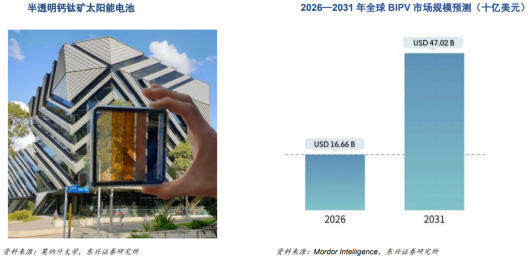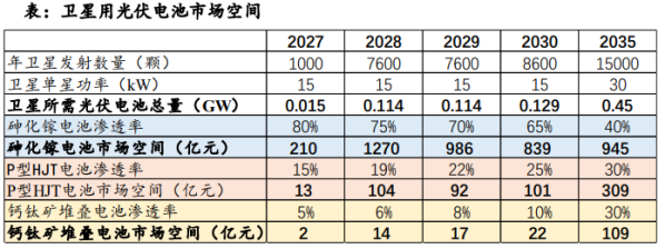 钙钛矿电池或成为光伏建筑一体化领域的主流选择。光伏建筑一体化(BIPV)对实现建筑领域碳达峰、碳中和具有重要意义,是降低建筑碳排放、推动建筑节能降碳和应对气候变化的有效手段。2022年3 月,住建部印发《“十四五”建筑节能与绿色建筑发展规划》,提出到2025年,全国新增建筑太阳能光伏装机容量0.5亿千瓦(50GW)以上的目标;2024年3月,国务院办公厅转发《加快推进建筑领域节能降碳工作方案》,提出试点推动工业厂房、公共建筑、居住建筑等新建建筑光伏一体化建设,加强既有建筑加装光伏系统管理;2025年1月,国家能源局印发《分布式光伏发电开发建设管理办法》,明确提出鼓励分布式光伏发电项目投资主体采用建筑光伏一体化的建设模式。钙钛矿太阳能电池板质地轻盈且光滑,可以制成全透明、半透明或各种颜色,并具有出色的柔性与延展性,可作为发电玻璃幕墙铺贴于楼宇表面。钙钛矿电池板的柔性特征使其能与建筑材料无缝集成,并具有轻薄、透明和可定制等优势,或成为光伏建筑一体化领域的主流选择。目前,由于钙钛矿电池稳定性不足,且大面积均匀成膜技术尚未成熟,其在建筑一体化领域渗透率仍然较低。2025年12月25日,全国首个大尺寸钙钛矿建筑一体化光伏示范项目,即昆山城市广场连廊分布式光伏发电项目(总建筑面积1931.123平方米,系统装机容量172千瓦),正式并网发电,标志着我国大尺寸钙钛矿光伏技术在建筑领域实现规模化应用。据Mordor Intelligence预测,2026-2031年间,全球BIPV市场规模或由166.6亿美元升至470.2亿美元,期间CAGR或达23.06%;同时,随着钙钛矿电池产品持续更新升级,钙钛矿电池在BIPV中的应用规模及渗透率或持续攀升。太空光伏的应用场景极大程度解决了钙钛矿商业化的量产问题:钙钛矿抗辐射能力优越,更适配太空环境:太空环境不存在潮湿、高温、强光、氧气等地面光伏限制环境因素;钙钛矿器件具有良好的辐射耐受性。根据《钙钛矿在太空光伏应用的研究进展》,在20MeV和68MeV质子辐照至累计剂量10¹²particles/cm²时,三价钙钛矿的PEQE仅下降7%,而作为辐射耐受基准的碳化硅二极管在相同条件下降幅达50%和75%。钙钛矿电池比功率更高,轻量化优势明显。钙钛矿电池能质比可达到10-30W/g级别,这意味着在同等功率需求下,钙钛矿电池系统能使卫星减重200公斤以上,大幅降低发射成本。钙钛矿电池折叠性极佳,非常适合制造柔性卷绕式太阳翼。它能够以极薄的厚度进行卷曲和折叠,在轨道上实现大面积展开,精准匹配未来低轨卫星和太空算力中心的大功率需求。短期来看,光伏主要用于太阳翼,为卫星供能;长期来看,太空光伏成熟后可支撑地球同步轨道太阳能电站建设。时至今日,我国向国际电信联盟(ITU)申请低轨卫星数量总数已达5.13万颗。其中数量超过万颗的星座计划有3个。通常来说,一人星座计划在立项7年内必须发射第一颗卫星,9年内要完成总规模的10%,12年内完成50%,到第14年,必须完成全部卫星的发射部署。国网星座:2020年9月,中国星网正式向国际电信联盟(ITU)提交低轨互联网星座计划,规划总规模达12992颗卫星,将部署于距地面590公里至1145公里的低轨轨道。按照规划,将在2030年之前完成10%卫星的发射,到2030年之后平均每年发射量将达1800颗。千帆星座:千帆星座计划2030年底,完成超1.5万颗低轨卫星的互联网组网。鸿鹄星座:2024年5月24日,鸿擎科技向国际电信联盟提交了频轨申请,计划将在160个轨道平面上总共发射约1万颗卫星。根据文昌国际航空航天论坛信息,从发射计划数据看,两大星座的发射量逐年攀升:2025年发射量尚处数百颗量级,2027年将突破1000颗,2028年国网、千帆星座分别计划发射4000颗、3600颗,合计达7600颗,2030年发射规模将进一步扩容至超8600颗。假设2035年卫星发射颗数约为2030年的一倍,单星功率参考SpaceX星链,V2mini型号单星功耗已突破15kW,后续V2.0及V3.0型号功率将进一步提升至30kW-60kW级,同时钙钛矿堆叠电池渗透率持续提升,预计在35年逐步替代砷化镓电池,且电池效率逐步提升。基于以上假设,2035年钙钛矿堆叠电池市场规模达到百亿元。上图仅为卫星用太空光伏规模,按照马斯克最终设想,未来每年向太空部署100GW的太阳能AI卫星能源网络的战略规划,假设采用钙钛矿方案,单gw投资额降低至5亿元,仅马斯克的太阳能AI计划就可以撬动500亿元市场空间,卫星用光伏仅为太空光伏一部分市场。05