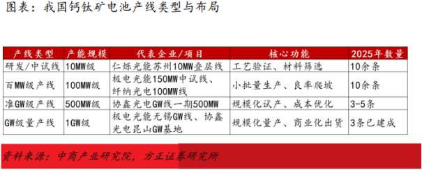 钙钛矿电池技术正步入商业化量产的关键阶段。单结钙钛矿电池的理论效率极限超过30%,通过与成熟晶硅技术叠加形成叠层电池,其理论效率上限可进一步上升至45%,为产业中长期发展打开了广阔空间。产业化进程已进入加速兑现期,头部企业相继取得实质性突破。2025年行业已进入GW级产线投产期,其中极电光能、协鑫光电的GW级单线已正式投产,纤纳光电、仁烁光能等企业的GW级产线预计陆续投产。