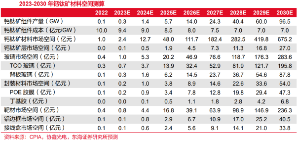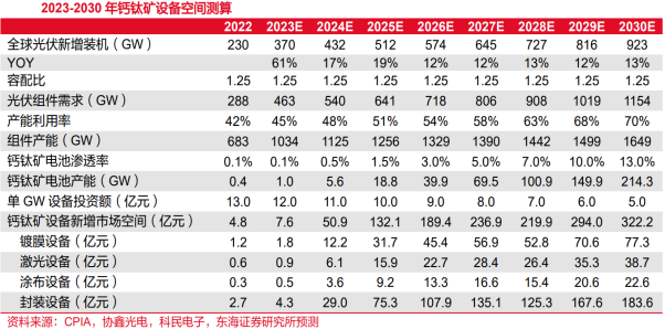 钙钛矿太阳能电池的产业化正处在从“技术验证”向“初期量产”过渡的关键阶段。单结钙层电池主要由协鑫光电、纤纳光电、极电光能等专业钙钛矿企业推动,致力于纯钙钛矿技术的产业化。钙钛矿-晶硅叠层电池是目前许多传统光伏巨头选择的方向,利用自身在晶硅领域深厚的技术积累和产业优势,通过在现有晶硅电池上叠加钙钛矿层来进一步提升效率极限,被视为突破晶硅单结电池效率极限的主流技术方案。随着技术路径逐步清晰、设备和材料成本下降、标准化体系同步推进,钙钛矿技术正进入商业化验证期。截至2025年,行业已建成3条GW级量产线,其中极电光能全球首条GW级产线已投产,协鑫光电GW级叠层基地部分启用,纤纳光电GW级产线预计2025年下半年投产,覆盖单结及叠层技术路线,宁德时代等跨界企业亦在筹备GW级产线,2026年仁烁光能等厂商有望跟进。钙钛矿技术快速发展,设备端最先迎来放量。预计2030年全球钙钛矿设备新增市场空间将达322亿元,2023-2030年CAGR约为171%,其中,镀膜设备/激光设备/涂布设备/封装设备市场空间分别为77/39/23 /184亿元,关键假设如下:假设2023-2025年全球新增光伏装机规模分别为370/432/512GW,2025-2030年全球新增光伏装机CAGR为12.5%,容配比为1.25。中性假设2023-2030年钙钛矿渗透率由0.1%提升至13%。根据科民电子,百兆瓦级钙钛矿产线设备投资额约1.2亿元,需镀膜设备3台,包括PVD设备2台(1000万元/台)和ALD设备1台(2000万元/台);需激光设备4台,总价值量约1000-1500万元;钙钛矿层及钝化层需涂布设备2台,合计约2000万元;需封装设备1台,单台价值约1200万,预计大规模量产后GW级产线设备投资额将降至5亿元左右。钙钛矿组件需求增长,有望带动钙钛矿材料市场规模快速扩张。根据协鑫光电测算,钙钛矿产能达到100MW时,生产成本为0.94元/W,如果组件效率达到17%,电池规格达到2.4㎡,组件成本将降至0.7-0.75元/W。若2030年钙钛矿组件产量达97GW,钙钛矿层市场空间将达27亿元,玻璃市场空间将达284亿元,其中,TCO玻璃约为196亿元,背板玻璃约为88亿元,封装材料市场空间将达54亿元,其中,POE胶膜约为47亿元,丁基胶约为7亿元,靶材市场空间将达236亿元,铝边框市场空间将达41亿元,接线盒市场空间将达34亿元。07