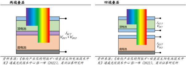 钙钛矿太阳能电池(PSCs)是利用钙钛矿型材料作为吸光层的新型化合物薄膜太阳能电池。钙钛矿是一类自然产生的陶瓷氧化物,最早发现于钙钛矿石中的钛酸钙化合物中,并因此而得名。钙钛矿主要在碱性岩中产生,偶尔也会出现在蚀变的辉石岩中,常与钛磁铁矿共生。2009年,日本科学家首次选用有机-无机杂化的钙钛矿材料,制备出全球第一个具有光电转换效率的钙钛矿太阳能电池器件。近年来,钙钛矿电池产业研究持续发展。2023年,钙钛矿材料入选工信部《前沿材料产业化重点发展指导目录(第一批)》。至2025年,国内已实现钙钛矿电池平方米级组件量产,并在稳定性上大幅突破。晶硅电池发展正在逐渐逼近理论效率极限。根据中商产业研究院数据,TOPCon电池的极限转换效率为28.7%,HJT极限转换效率为27.5%,HJT与TOPCon的量产效率逐渐逼近理论效率极限。根据中商产业研究院预计,当前钙钛矿的市场渗透率仅有0.2%左右,预计2030年可以实现30%的渗透率。钙钛矿凭借优异的光电特性、高吸收系数、长激子扩散距离、高的载流子迁移率、低的激子结合能等优点有望成为光伏电池的未来发展方向。钙钛矿是一种立方体的ABX3晶体结构,其中B离子位于立方晶胞的中心,被6个X离子包围;A离子位于立方晶胞的角顶,被12个X离子包围。钙钛矿薄膜太阳能电池的理论效率高达50%,理论效率决定了生产成本和使用效率的性价比较高。另外根据CBG资讯数据,钙钛矿材料具有高吸收系数、长激子扩散距离、高的载流子迁移率、低的激子结合能等优异的光物理性质。钙钛矿有较好的弱光性能,冬季同等条件下钙钛矿组件相较晶硅多发电9.3%。根据德护涂膜数据,钙钛矿对光的吸收能力强,光谱吸收范围广,即使在室内等弱光条件下,钙钛矿仍能保持较高的光电转换效率,而传统晶硅电池由于带隙较窄,弱光下的发电效率较低。根据极电光能数据,随着辐照度的降低,钙钛矿组件的相对效率逐渐升高,当光照强度达到600W/㎡—800W/㎡的时候,钙钛矿组件的相对效率达到最高,为标准光照下的111%。晶硅组件辐照度在700-1000W/㎡区间内,组件效率与标准光强下的效率相当,当辐照度低于100W/㎡时,其组件效率仅为标准条件下的96%左右,而钙钛矿组件即使在辐照度低于100W/㎡时,组件效率仍然为标准条件下的104%。相较于冬季同等条件下的晶硅组件,弱光发电增益能力可为钙钛矿组件带来约9.3%的额外发电。相比较晶硅电池,钙钛矿生产链条较短,封装材料成本占比较高。晶硅产业链较长,各环节进入壁垒高,导致价格波动大、扩产周期长。根据极电光能数据,钙钛矿产业链非常短,在一个工厂内即可完成从原料到组件的全部工序,而且钙钛矿电池材料在纯度方面要求不高,只需要达到99%~99.9%就能生产优质电池。封装材料在生产成本中占比较高,根据中商产业研究院数据,在钙钛矿电池组件中玻璃及其他封装材料占34%,电极材料占30.9%,钙钛矿成本仅为3.1%。钙钛矿在当前量产效率下的理论成本最低可以实现1元/W,相关人士认为认为钙钛矿成本降低仍有空间。根据相关文献测算,钙钛矿薄膜的生产成本理想状态下可以实现2g/㎡钙钛矿材料对应10元/㎡的生产成本、其他界面层薄膜的成本可以实现25元/㎡、FTO玻璃可以实现40元/㎡、后电极10元/㎡合计85元/㎡材料成本,假设封装材料合计50元/㎡,折旧、人工和能源成本合计45元/㎡,累计钙钛矿组件成本可以在理想状态下实现180元/㎡。由于目前协鑫大尺寸钙钛矿电池的量产效率已经实现约18%,在该效率下对应单平米电池功率约为180W,所以在当前效率下理想状态下的成本可以实现1元/W,和目前晶硅组件的成本相当。但是由于钙钛矿电池的效率依然有提升空间,所以钙钛矿的单位成本或依然有较大的降低空间。单结钙钛矿电池转换效率仍将受到SQ辐射极限的限制,叠层电池可以进一步实现提效。由于理想的单结电池中,电子和空穴仅仅通过辐射复合发出光子,理论效率极限称为Shockley-Queisser极限,约31%。而打破SQ极限的有效方法之一是制备由仅吸收短波长光能的宽带隙子电池和主要吸收长波长光能的窄带隙子电池组成的叠层太阳能电池。两端叠层电池制备难度较大,四端叠层更容易实现更高效率。为了确保两端叠层内部的电子和空穴复合需要制备中间层,而中间层成为影响两端叠层电池效率的关键。叠层电池为了将各单结电池吸收光谱分配合理,以获得更高效率,需要解决上下电池匹配度的问题,因此需要在两端串联电池中对带隙、薄膜厚度以及连接层之间进行协同优化。而四端叠层电池的两个子电池具备独立工作的能力,四端电池不需要匹配的电流就可以有效完成分配光吸收的任务,更容易实现比两端串联电池更高的效率。02