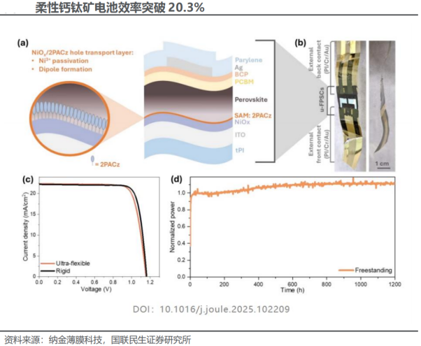 中科院研制的单节钙钛矿电池效率突破27.2%。2025年11月11日,中国科学院半导体研究所游经碧研究员领导的科研团队研制出光电转换效率为27.2%的钙钛矿太阳能电池原型器件。器件在1个标准太阳光和最大功率输出点条件下持续运行1529小时后,仍可保持初始效率的86.3%。此外,器件在1个标准太阳光与85℃光热耦合加速老化条件下,持续运行1000小时后仍能维持初始效率的82.8%。相关成果在国际学术期刊《科学》发表。实现高效率钙钛矿太阳能电池的关键要素之一是制备高质量的钙钛矿半导体薄膜。中科院科研团队通过在钙钛矿薄膜生长中引入碱金属草酸盐,利用解离出的钾离子与氯离子之间的强结合作用,有效束缚氯元素的垂直无序迁移,使其在钙钛矿材料中均匀分布。基于这一方法,研究团队成功制备出载流子寿命高达20微秒,界面缺陷态密度低至1013每立方厘米的钙钛矿半导体薄膜。2025年11月17日,西湖大学王睿团队等人在《Nature Communications》上发表的研究,直面FAPbI₃钙钛矿光伏中残留MA⁺导致的稳定性瓶颈,实现了26.1%的转换效率。在55°C、连续单太阳光光照下进行最大功率点跟踪,目标器件在1000小时后仍保持超过95%的初始效率。而使用MACI添加剂的对照组器件则在约500小时后性能降至初始值的60%。甲基氯化铵(MACI)添加剂能有效促进α-FAPbI₃形成,但其热分解后残留的MA⁺在热/光应力下会显著损害器件长期稳定性。团队开发了一种α相辅助反溶剂方法,使用不含MACI的前驱体,并通过在反溶剂中引入甲基氨基硫氰酸盐(MASCN)成功制备了MA残留极低的α-FAPbI₃薄膜。MASCN显著降低了α-FAPbI₃的形成能,促进了钙钛矿从湿膜直接向α相转变,绕过了δ相中间产物,形成了高质量的晶体。此外,2025年8月11日,海南大学可再生能源光电材料与器件团队自主研发的单结钙钛矿电池稳态光电转换效率达27.32%,在较短时间内取得了第三代光伏技术领域的突破。(2)柔性钙钛矿电池小面积(0.04cm²)器件效率达到20.3%柔性钙钛矿太阳能电池因其轻量化、可弯曲等特性,在可穿戴设备、物联网、航空航天等领域具有广阔应用前景。上海交通大学戚亚冰教授与多所科研机构合作,在超柔性钙钛矿太阳能电池领域取得关键突破。研究创新性地提出“氧化镍(NiOx) 自组装单分子层(2PACz)”的双空穴传输层结构,解决了超柔性钙钛矿太阳能电池长期面临的“效率与稳定性难以兼顾”的问题。一方面,NiOx纳米颗粒凭借100℃的低温制备特性,可以降低其对柔性透明聚酰亚胺(tPI)基底的热损伤;另一方面,2PACz自组装单分子层通过界面偶极效应的精准调控,将NiOx的能级与钙钛矿材料的能级实现了高度适配。团队采用2.1μm厚的tPI基底与130nm厚的非晶ITO组合,并搭配NiOx/2PACz双空穴传输层,使小面积(0.04cm²)器件的效率达到20.3%。同时,通过原子层沉积技术制备15nm厚的氧化铝/聚对二甲苯双层防护结构,让器件在空气中效率保持90%的时间达到130小时,保持80%的时间达到260小时。(3)宁德时代首次成功实现光电转换效率超过20%的1m×2m大尺寸钙钛矿光伏模组上海交通大学赵一新教授团队与宁德时代21C创新实验室合作,在国际上首次成功实现光电转换效率超过20%的1m×2m大尺寸钙钛矿光伏模组,创造了该领域的世界纪录。该研究创新性地提出“基质限域分子层”型空穴传输层构型新概念,突破了传统自组装单分子层空穴传输层体系中面临的分子聚集、堆叠和结晶的本征限制。团队利用具有强吸电子能力与优异化学稳定性的三(五氟苯基)硼烷分子构建主体骨架,将空穴传输分子分散于BCF基质中,形成类似于“枣糕结构”的传输层。这一创新结构有效抑制了空穴传输分子的堆叠倾向与聚集行为,解决了制约大面积钙钛矿光伏模组发展的薄膜不均匀、界面不稳定难题。2025年11月19日,军事科学院国防科技创新研究院常超、北理工徐健、南京大学林仁兴和谭海仁等人开发了一种偶极钝化策略,在降低Pb-Sn钙钛矿埋底界面陷阱密度的同时,实现了HTL/钙钛矿界面的精准能级对齐。该策略增强了欧姆接触,促进空穴高效注入HTL,并将电子排斥出界面,从而将载流子扩散长度提升至6.2μm,使Pb-Sn钙钛矿电池效率提升至24.9%(Voc=0.911V,Jsc=33.1mAcm⁻²,FF=82.6%)。此外,该策略有效缓解了叠层器件互联层引起的接触损失,最终实现全钙钛矿叠层电池的30.6%效率(认证稳态效率30.1%)。2025年11月27日晶科能源宣布基于N型TOPCon的钙钛矿叠层电池转化效率突破34.76%。这是晶科第32次打破电池效率和组件功率世界纪录。该数据经国家光伏产业计量测试中心(NPVM)权威认证,此结果标志着晶科在下一代钙钛矿叠层技术领域的布局取得了重大进展。从产业价值来看,该技术成果不仅展现了晶科在钙钛矿技术研发上的深厚积累,也为其后续在高效叠层电池产业化布局方面提供了技术支撑。京东方采用刚性/柔性/叠层组件技术路线并行开发,三大研发平台效率不断突破,实现了从手套箱(2.5*2.5cm)到实验线(30*30cm)再到(1,200*2,400cm)三大平台全工艺流程拉齐。刚性组件方面,目前手套箱转换效率经计量院认证达到27.3%,基础科研达到一流水平;实验线转换效率23.49%;中试线全面积转换效率20.01%。分别实现了小面积、中面积和单结大面积器件效率行业第一梯队。柔性组件方面,京东方转换效率持续提升,实验线转换效率达到20.11%;中试线全面积效率达到17.7%,实现业内面积最大同时功率最大