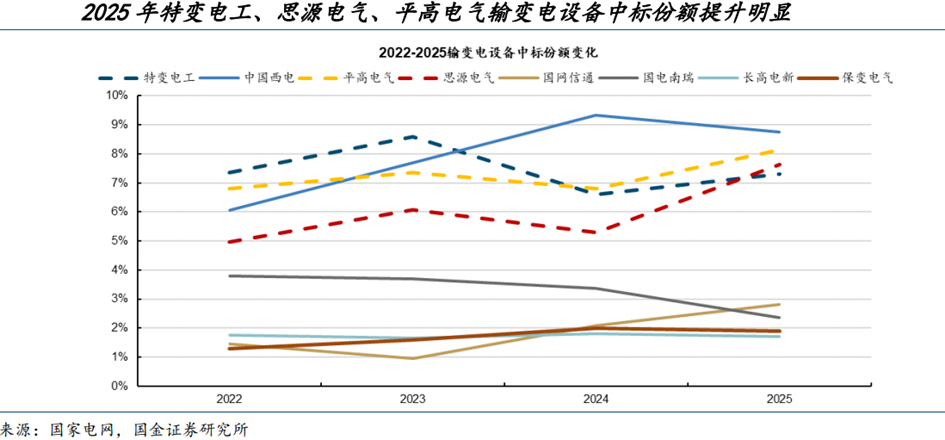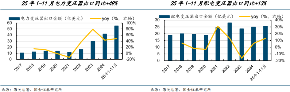 变压器作为电网核心设备,近几年出口情况始终维持高位。其中,电力变压器出口增速相比配电变压器更高,25年1-11月电力变压器出口55亿美元,同比 49%,配电变压器出口25亿美元,同比 13%,主要由于电力变压器技术难度更高、扩产周期更长。考虑到海外主流电力设备厂商受原材料(硅钢、铜等)潜在缺口、电气工程师和装配工短缺、扩产投资回报周期较长等因素影响,扩产决策相对谨慎。同时考虑到国内电力设备企业海外市场开拓、准入认证流程往往需要更长时间,预计变压器供需错配局面仍将维持,思源电气、华明装备、金盘科技等企业有望充分受益。