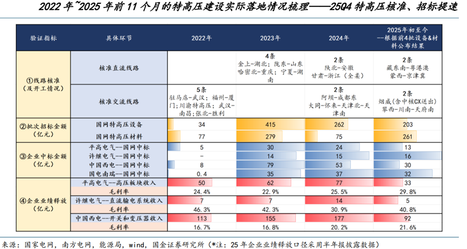 作为我国电力系统的战略性主干网络,特高压电网凭借其远距离、大容量、低损耗的先进输电能力,已成为提升新能源消纳水平、实现能源跨区域优化配置的核心路径。当前,国内特高压项目的核准与建设进程显著提速,25年以来特高压已核准3交(烟威、攀西-川南-天府南、浙江环网)2直(蒙西-京津冀、藏东南-粤港澳)。11月,国网特高压项目第五次前期服务招标采购公示,青海-广西、库布齐-上海开展可研招标,可研预计分别于2026年6月/3月完成。展望2026年,预计特高压核准5条直流线路(陕西-河南、巴丹吉林-四川、南疆-川渝、库布齐—上海、青海-广西)。“十五五”期间风光大基地外送需求强,直/交线路有望每年核准4条/2条。