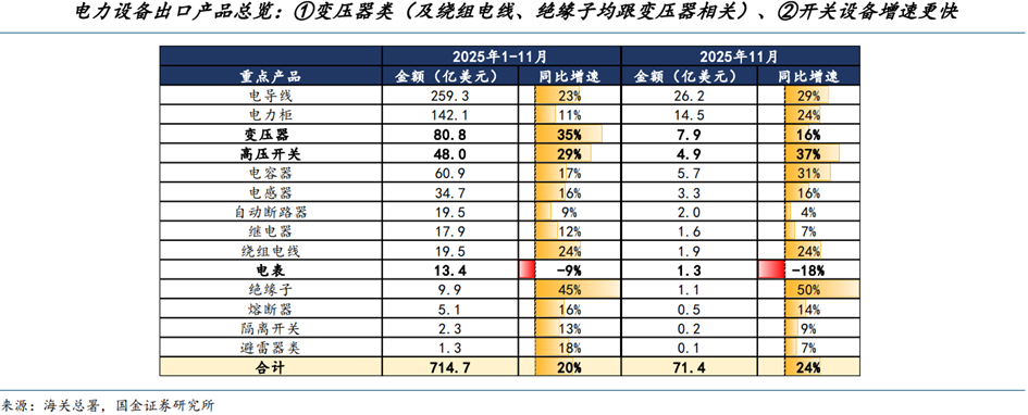 中国在全球电网设备供应格局中扮演着核心角色。依托领先的生产规模、持续创新的技术能力、显著的制造成本优势以及完善的全产业链协同能力,中国相关产业在国际市场上的竞争力不断增强。出口数据显示,2025年1-11月重点电力设备出口715亿美元,同比 20%,海外电力设备需求维持较快增长。其中,变压器、绕组电线、绝缘子、开关设备分别同比35%、24%、45%、29%,贡献更高增速。