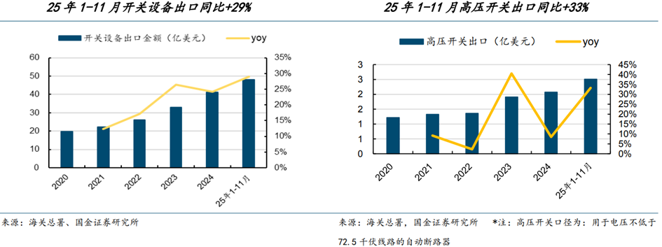 与此同时,开关设备2025年1-11月出口金额48亿美元,同比较快增长29%,加速上行。高压开关技术壁垒和行业不透明程度要高于变压器类,同时全球的扩产需求相对较少,我国本土企业逐渐通过资质认证和更多海外挂网运行资历来获得更多的外溢订单。