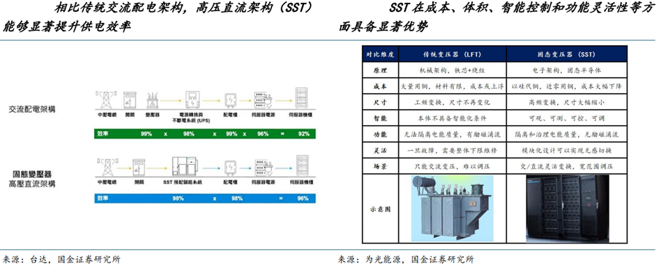 另外,随着高功耗AI芯片大规模部署,未来AI数据中心AIDC的单机架功率需求将攀升至600kW-1MW量级,巨大电力需求倒逼数据中心必须在现有供电能力下挖掘能效潜力。在这一背景下,相比传统的交流配电架构,高压直流供电架构因其能显著减少AC/DC转换环节、降低传输损耗、提升系统可靠性和功率密度,正被视为应对挑战的主流技术方向。而固态变压器(SST),正是实现这一高效、紧凑型高压直流架构的核心设备。固态变压器利用功率半导体技术,通过引入IGBT/SiC等功率半导体,人为地将电能变换频(f)提升了成百上千倍,根据电磁感应定律,使得SST能在传输同等功率下,将变压器体积缩小,在成本、体积、智能控制和功能灵活性等方面具备显著优势。面对新兴的市场机遇,中国相关企业在此前沿领域已着手积极布局。