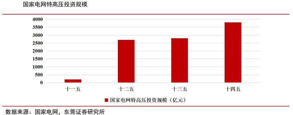 根据国家电网,“十四五”期间,国家电网规划建设特高压工程“24交14直”,涉及线路3万余公里,变电换流容量3.4亿千伏安,总投资3800亿元,较“十三五”期间特高压投资规模增长35.7%。