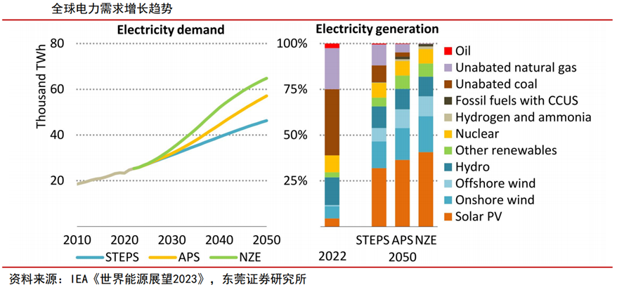 IEA根据三种不同的情景,对未来世界能源需求和能源结构进行了展望,在各个情景下全球电力需求都将迅速增长。NZE是指要实现到2050年净零排放情景,即将全球温升限制在1.5℃以内的情景。在NZE情景中,2022年至2050年,电力需求将增长150%,且全球新增的电力需求将更多由低排放电力来源满足,如太阳能、风电、氢气及其他可再生能源,化石燃料的份额急剧下降,其电力总产量比重将下降近100%。