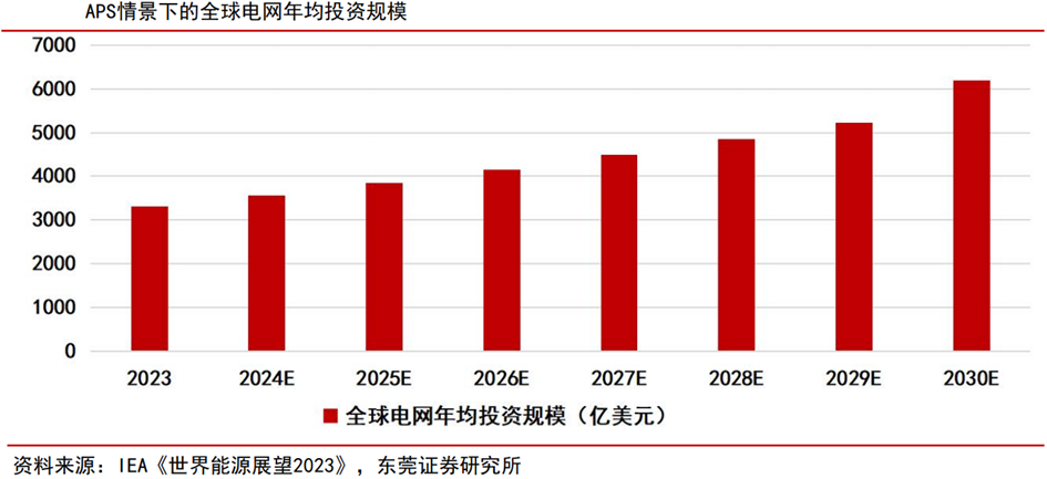 当前,全球电网投资趋势与实现气候目标所需的投资之间存在差距,尤其是在新兴市场和发展中经济体。2023年,全球电网投资规模约3300亿美元,在APS情景下(即假设各国政府制定的国家能源和气候目标都能按时全部实现来进行的展望),2023—2030年全球电网年均投资规模需以年均复合增速9.4%增长,全球电网年均投资规模具备较大增长空间,为国内电网设备企业带来新的出海机遇。