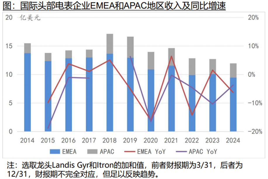 我国电表出口额持续增长,国际头部企业在亚非拉欧市场营收进入下行通道。据OEC数据,2000-2022年,我国电表出口额增速达17.4%,在全球出口占比从2000年的3.8%提升至2022年的26.7%。国际电表头部企业LandisGyr和Itron在EMEA和APAC区域营收合计值于2018-2019年达到峰值,此后持续减少,2024年仅为峰值7成左右。