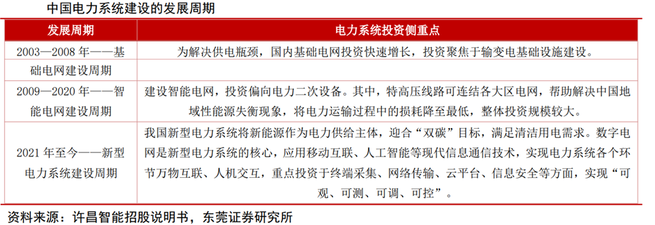 电力系统建设关系到国家供电安全、能源战略及社会民生,根据不同的投资侧重点,自2003年以来我国电力系统建设大体分为三个发展周期。