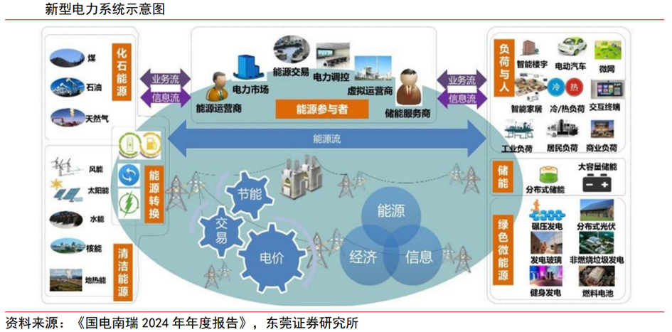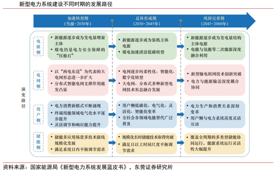 根据国家能源局发布的《新型电力系统发展蓝皮书》,制定新型电力系统分为三个发展阶段。在加速转型期,即当前至2030年,新能源将逐步成为发电量的增量主体煤电仍是电力安全保障的“压舱石”。在电网侧,以“西电东送”为代表的电网形态将进一步扩大,分布式智能电网支撑作用越发凸显。