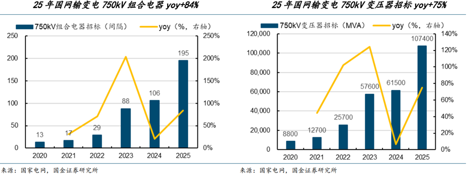 西北地区送端扩建和受端电站升级的双轮驱动是国网主干网投资的主要增量贡献来源。西北作为新能源外送枢纽,其750kV/330kV骨干网架建设持续加密,特高压直流密集接入引爆配套交流设备需求。与此同时,东部受端为承接跨区输送及保障消纳,500kV电网升级同步提速。送受两端供需共振,构筑了主网投资增长的核心驱动逻辑。作为西北电网建设的两大核心设备,750kV变压器与组合电器(GIS)需求显著提速。2024年稳步增长:750kv变压器/组合电器招标量分别为6.15万MVA/106间隔,同比分别增长7%/20%;2025年全面放量:预计招标量将跃升至10.74万MVA/195间隔,同比增速飚升至75%与84%,行业景气度呈现阶跃式提升。