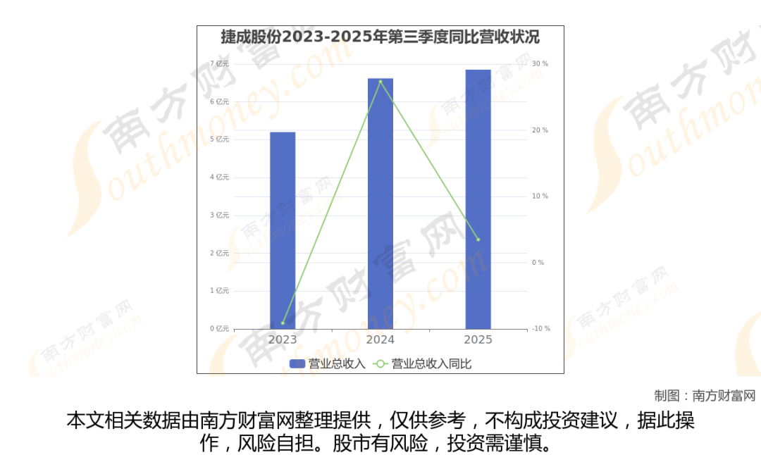 捷成股份2025年第三季度报告显示(如上图),公司实现主营业务收入6.85亿元,较去年同期增长3.48%。