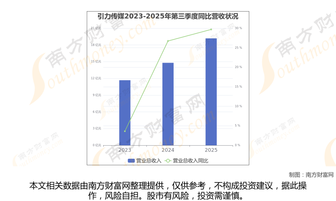 于2025年第三季度,引力传媒披露了其业绩表现(如上图),其中主营业务收入19.19亿元,相较于去年同期29.7%。