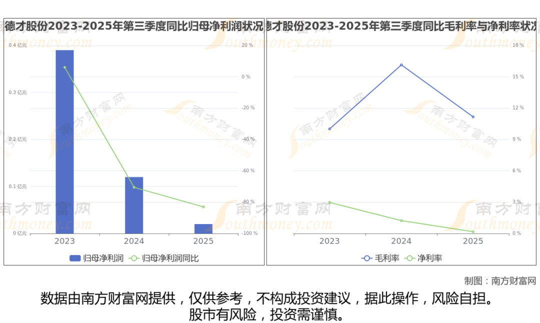 公司2025年第三季度季报显示,德才股份实现净利润196.29万,同比增长-83.03%;毛利润为7861.33万,毛利率11.16%。