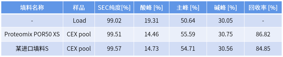 Proteomix POR50-XS对于纯度、回收率与酸碱峰控制都有较好的层析表现,且略佳于进口填料S。