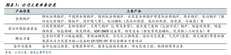 公司主要业务包括余热锅炉、清洁环保能源装备、解决方案、备件及服务等四大板块。1)余热锅炉主要包括燃机余热锅炉、干熄焦余热锅炉等产品,客户包括五大电力、钢铁、建材、水泥等高耗能行业企业。2)清洁环保能源装备包括垃圾焚烧锅炉、熔盐吸热器、换热器、储罐及核电设备等,主要用于垃圾废物处理厂、石化厂、核电站和光热项目等新能源领域。3)解决方案主要包括换热器及压力容器为核心设备的EP/EPC/PC等综合解决方案项目。4)备件主要包括过热器、省煤器等部件,服务包括技术服务、项目改造工程、维修维保等业务。