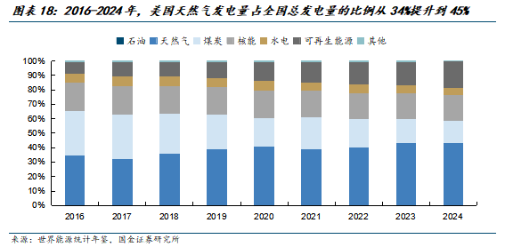 AIDC加剧全球电力消耗,催化燃气轮机需求上行。根据高德纳,目前全球数据中心数量高速增长,导致电力需求高增,2023-27年全球AI服务器用电量将从195太瓦时提升到500太瓦时。燃气轮机发电是美国主要发电方式,2016-2024年,美国天然气发电量占全国总发电量的比例从34%提升到45%。展望未来,我们认为,燃气轮机发电凭借项目建设速度快、发电稳定、启动速度快,成本低等优势,未来有望成为AI数据中心领域供电的重要方案,看好燃气轮机长期需求上行。