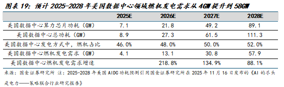 根据国金证券研究所电子行业组在《AI的尽头是电力——策略联合行业研究报告》中的测算,2025-2028年美国数据中心算力芯片功耗预计从7.1GW提升到89.1GW,考虑到冷却系统等耗电,算力芯片约占整个数据中心功耗的80%,美国数据中心总功耗约从8.9GW提升到111.3GW。我们考虑到燃气轮机发电成本低、发电稳定、启动速度快等优势,未来在AIDC领域的渗透率有望持续提升,我们假设2025-2028年美国AIDC领域燃机发电占比将逐步从46%提升到52%左右,则美国AIDC对应燃机需求为4.1GW-57.9GW,26-28年增速分别为219%/135%/88%。