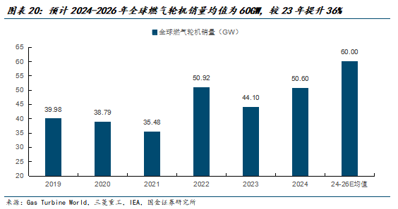根据Gas Turbine World和三菱重工预测,2019-2023年全球燃气轮机销量从39.98GW提升到44.1GW,CAGR为2.49%,预计2024-2026年全球燃机年均销量为60GW,较23年的44.1GW提升36%,增长加速。