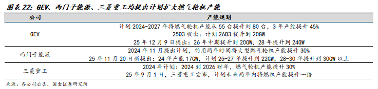 燃机主机厂规划扩产,有望带动上游零部件环节需求上行。2024年开始,GEV、西门子能源、三菱重工等全球头部燃机厂商均提出燃气轮机的扩产计划,例如GEV在 25年12月9日提出:26年中期将产能提升到20GW,28年提升到24GW。西门子能源在25年11月20日提出,24年产能17GW,计划25-27年提升到22GW,28-30年提升到30GW以上。三菱重工25年9月1日三菱重工宣布,计划未来两年内将燃机产能提升一倍。当前全球头部主机厂纷纷提出或者上修扩产目标,有望带动配套余热锅炉需求上行。