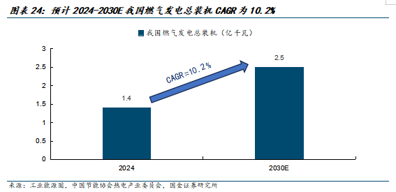 截至2024年,中国发电装机33.5亿千瓦,其中燃气发电装机1.4亿千瓦,燃气发电装机占比仅4%,而全球占比达22%,未来提升空间较大。根据中国节能协会预测,到“十五五”末,2030年我国燃气发电总装机有望达2.5亿千瓦,2024-2030年CAGR为10.2%。气电装机的持续提升有望带动我国燃机余热锅炉需求的长期提升。