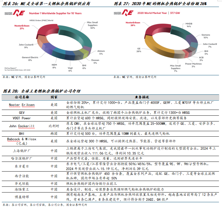全球燃机余热锅炉格局集中,供给方包括GEV等头部燃气轮机整机厂,以及NE、VOGT、John Cockerill、西子洁能等第三方供应商两类。在燃机主机厂中,GEV既是燃机整机龙头,也是余热锅炉等配套设备龙头,2015年收购了韩国斗山的余热锅炉业务,截至2025年,已累计出售了1300台余热锅炉。第三方供应商中,NE是全球第一大HRSG供应商,也是北美市场最大的HRSG供应商,全球份额在20%以上。此外,全球头部第三方供应商还包括美国VOGT、比利时John Cockerill、韩国BHI等。国内企业包括西子洁能、华光环能、海陆重工等,其中西子洁能国内份额50%以上。从区域上看,根据智信中科,北美是全球最大的余热锅炉市场,市场份额约25%。之后是中国和欧洲市场,二者合计占比约45%。