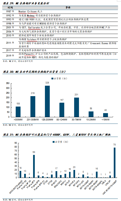 NOOTER/ERIKSEN(简称NE)是全球第一大HRSG供应商、北美第一大HRSG供应商,发展历史悠久。根据NE官网,NE成立于1987年,1992年为英国Medway项目提供首个余热锅炉,2010年在美国市场提供首个H级余热锅炉,目前在全球范围已经累计交付超过1000台NE余热锅炉,输出功率从2MW-300MW不等。除了燃气轮机余热锅炉,NE还能提供多种其他类型锅炉,包括太阳能接收器、燃烧锅炉、生物质锅炉等。