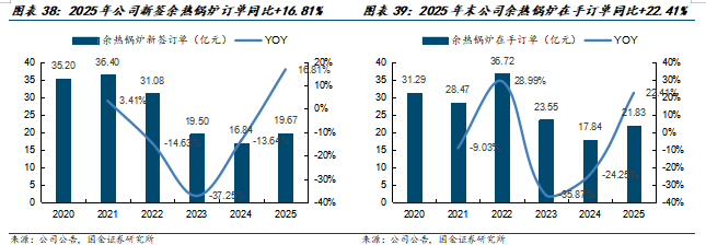 海外市场需求上行,看好公司后续出口订单持续提升。根据公司官微,公司近年来发力海外市场,HRSG远销东南亚、南美洲、非洲、中东等“一带一路”沿线国家及地区。近年来,公司斩获了批量的海外项目订单,海外订单占比超20%。标志性项目包括巴基斯坦必凯9H级HRSG(当时全球容量最大的联合循环电厂项目)、尼日利亚12台9E燃机余热锅炉项目(全球最大的天然气自备电站订单)等。未来,公司规划加快全球布局,全力推动燃机余热锅炉全球化及北美市场的订单机会落地,看好公司海外订单持续提升。2025年公司新签余热锅炉订单19.67亿元,同比 16.81%;年末在手订单21.83亿元,同比 22.41%,订单加速提升。