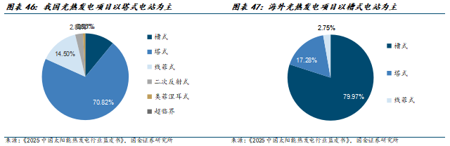 我国光热发电项目主要以塔式电站为主,海外以槽式为主。根据《2025中国太阳能热发电行业蓝皮书》,2025年我国光热发电累计装机容量中,塔式占比70.82%,槽式仅约占10.93%,与国外装机比例相差较大,主要原因是导热油槽式产生的主蒸汽温度为380℃左右,而熔盐塔式主蒸汽温度为550℃,塔式的热电转换效率高。此外,我国2016年以来运行的塔式电站的熔盐吸热器可靠性较高,因此我国大多数新投资电站选择了热电效率高的塔式聚光技术路线。