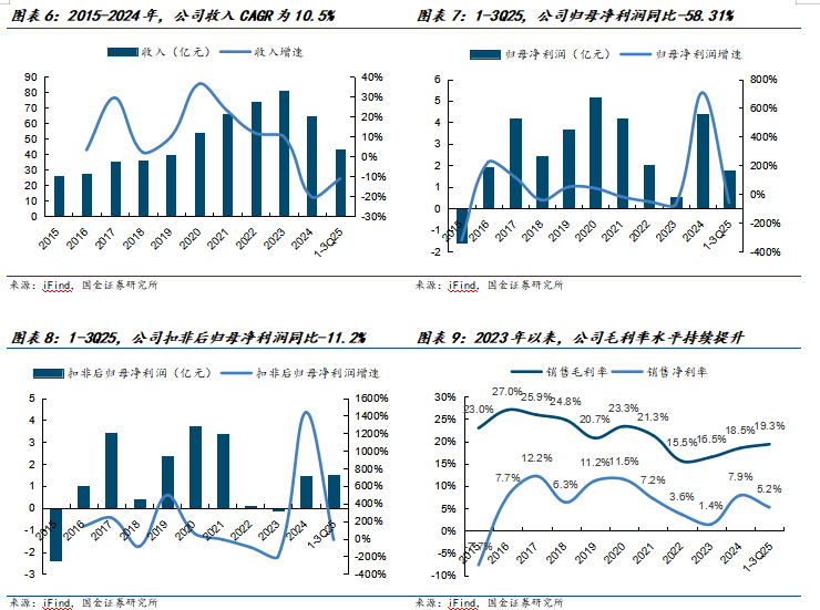收入长期稳健增长,利润端2025年持续高增。2015-2024年,公司收入从26.2亿元提升至64.37亿元,CAGR为10.5%,长期稳健增长。其中2024年由于国内余热锅炉市场增速放缓,公司收入同比-20.33%,但是公司大力拓展海外市场,不断优化订单结构,全年毛利率为18.47%,较2023年提升2.01pcts。1-3Q25公司实现收入43.33亿元,同比-11.20%,实现扣非后归母净利润1.50亿元,同比-11.15%,主要系25Q3公司部分出口海外的已生产完工锅炉设备延迟至25Q4发运。根据2025年业绩预告,公司2025年加强销售订单质量管控,全年毛利率较上年继续提高,公司预计2025年实现扣非后归母净利润2.2-2.8亿元,同比提升53.3%-95.11%,在2024年大幅提升的基础上保持高增。