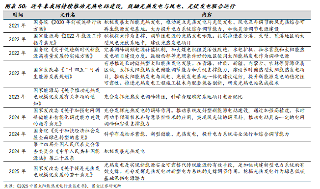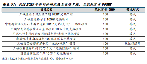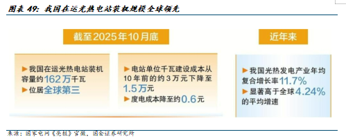我国对光热发电的重视程度较高,近年来鼓励发展政策频出。基于光热电站自带储能的特性,可与光伏、风电组合,提升国内可再生能源的并网比例。近年来,我国多次推出鼓励光热发电技术发展的政策。2025 年12月,国家发展改革委《关于促进光热发电规模化发展的若干意见》明确提出:光热发电是实现新能源安全可靠替代传统能源的有效手段,是加快构建新型电力系统的有效支撑。