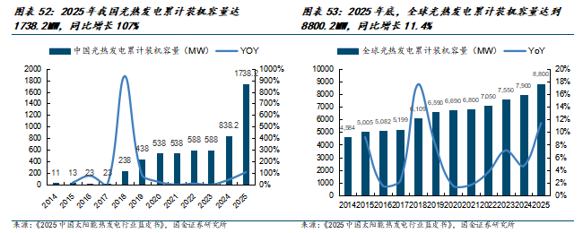 根据太阳能光热产业技术创新战略联盟,2025年,我国新增并网光热电站9座、总装机容量900MW。截至2025年底,我国光热发电机组累计装机容量达到1738.2MW(共27座),较2024年增长107%。2025年全球累计装机容量达到8800.2MW,同比增长11.4%,得益于2025年中国累计装机规模的翻倍增长,全球总装机规模也实现加速提升。