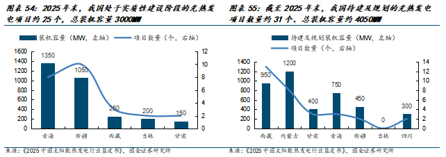 我国目前在建、待建及规划的光热发电项目较多,未来装机规模有望持续高增。根据太阳能光热产业技术创新战略联盟统计,截至2025年末,我国处于实质性建设阶段的光热发电项目约25个,总装机容量3000MW。我国待建及规划的太阳能热发电项目数量约31个、总装机容量约4050MW。按照国际能源署预测,中国光热发电市场到2030年将达到29GW装机,到2040年翻至88GW装机,到2050年将达到118GW装机。