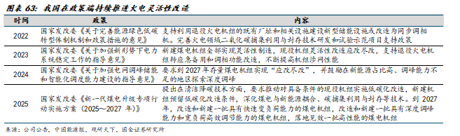 我国在政策端持续推进火电灵活性改造,助推煤电向调峰支撑电源转型。我国当前煤电机组存量较大,随着风光并网增多,实现煤电机组灵活调峰将对提升电力系统灵活性、促进新能源电力消纳具有重要意义。为推动煤电由传统基荷电源向调峰支撑电源转型,成为提升电力系统新能源消纳能力的关键路径,火电灵活性改造是实现这一转型的核心举措。