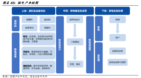 核电产业链可分为上游、中游、下游三个主要环节。上游为原材料与设备制造,中游为核电站建设与运营,下游为乏燃料处理与核电综合利用。