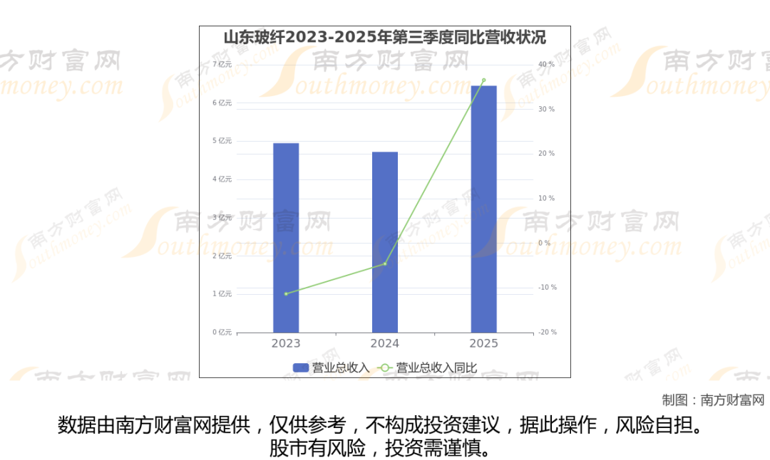 山东玻纤2025年第三季度报告显示(如上图),公司实现主营业务收入6.45亿元,较去年同期增长36.57%。
